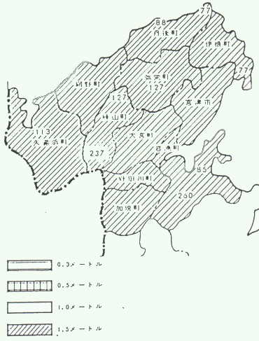 | 当地方の過去最深積雪量(cm)の地図 |