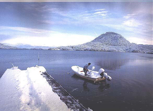 雪化粧をしたかぶと山と、眠りについたように静かな久美浜湾が、美しい一服の墨絵のようです。