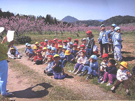 果樹園が淡いピンクの桃の花で満開になるころ、保育園児たちがしばしば散歩に訪れます。