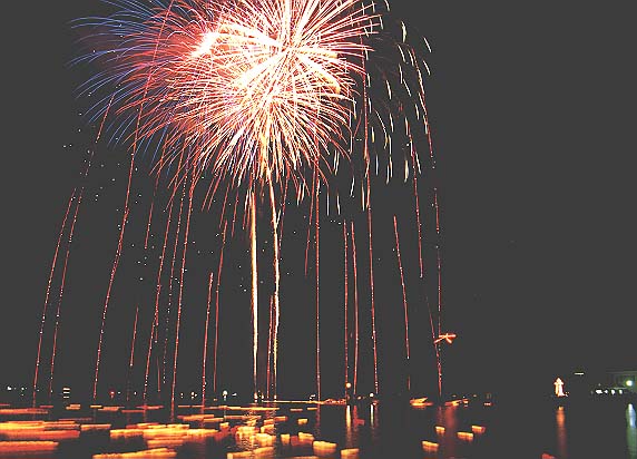 この日に参拝すると、千日参ったのと同じ御利益があるとされるのが如意寺で行われる千日会。夜は打ち上げ花火を合図に、かぶと山の大文字が点火され、5000個の灯籠流しで、久美浜湾が照らし出されます。