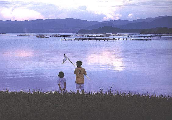 2人の目の前にある「カキ棚」は、久美浜で欠くことのできない美しい風景を作り出します。