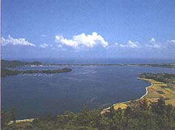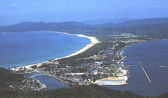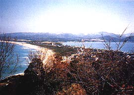 左は、時には怒濤逆巻く日本海、真ん中には6kmに及ぶロングビーチを抱える小天橋の砂嘴、右には波静かな久美浜湾(松江の浦)が望めます。後方左手には木の間より蒲井、旭の集落を見ることができます。あなたがもし強運の方であれば能登半島を望むこともできます。(見えるかな?)