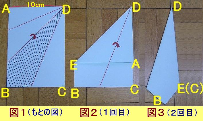 <問題> コピー用紙や教科書はある規格に基づいた長方形です。この長方形の紙ABCDを、次のように2回折りました。 【1回目】10cmの辺ADを辺CDに重ねて折る。辺ABと折り目との交点をEとします。 【2回目】折り目EDを辺CDに重ねて折ります。 このように折ると、点Eと点Cがぴったり重なります。上図1〜図3は折っていく様子を示したものです。 ここで問題です。 図3の四角形つまり図1の斜線をつけた四角形の面積を求めてください。 |
