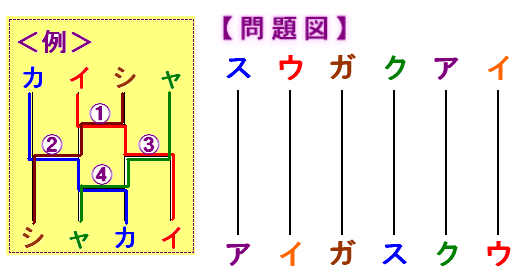 <問題> 今月はあみだくじの問題です。例のようにカイシャ(会社)をシャカイ(社会)に移動させるには、上図のように最小4つの横棒が必要です。 ここで問題です。 スウガクアイ(数学愛)をアイガスクウ(愛が救う)に移動させるには、最小何本の横軸を書くことが必要でしょうか。 |