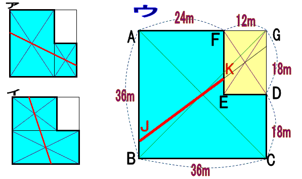 <問題> 上図を見てください。AB=36m、BC=36m、CD=18m、ED=12m、FE=18m、AF=24mのL字型をした土地があります。この土地の面積を2分割するには、アやイのように2つの長方形に分けて、対角線の交点を結べば簡単にできます。 また、ウのように正方形ABCGの対角線の交点と、長方形FEDGの交点を結んだ線を切り取り線としても、2等分できます。 ここで問題です。ウの方法で分割した場合、切り口の長さJKの長さは何mになるか求めて下さい。 |