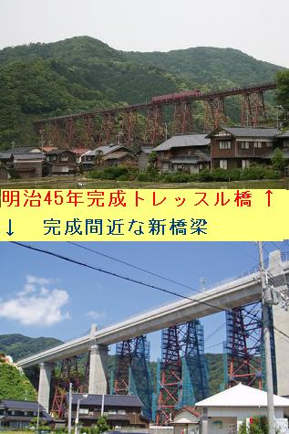 <問題> 2両編成のキハ47型の列車が時速36.0kmで進んでいる。この列車が鉄橋にさしかかってから、車両全てがわたり終えるのに35秒かかりました。 また、時速46.8kmで進む4両編成の列車が鉄橋にさしかかってから、車両全てがわたり終えるのに30秒かかりました。 ここで問題です。この鉄橋の長さは何mででしょうか。 (単純な問題であり、皆さんのレベルに合っていなくて申し訳ありません) 兵庫県北部にある「餘部鉄橋」が長い歴史を閉じました。この橋梁は、明治45年に完成した、高さ41メートル、11基の橋脚を持つトレッスル橋です。その独特な構造と鮮やかな朱色がもたらす風景は、観光客にも人気がありました。 |