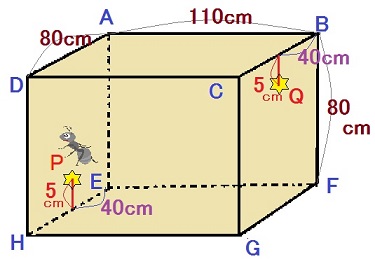 <問題> 右の図に示すような、縦、横、高さが80cm、110cm、80cmの直方体(ABCD-EFGH)の容器があります。 この直方体の面(BCGF)の辺BCの中央から5cmの下の点Qに蜜がついています。 また、面(ADHE)の辺EHの中央から5cmの上の点Pに蟻がいます。 このとき、蟻が直方体の面の内側を蜜のところまで這っていきます。 ここで問題です。 蟻が這っていくのに最短距離は何cmでしょうか。ただし、蟻は直方体の6面のどの面も歩けます。 |