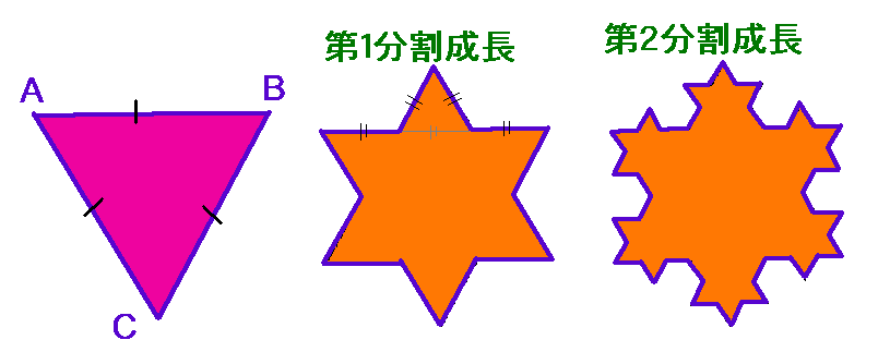 上図を見てください。 正三角形ABCがあります。この三辺をそれぞれ三等分します。 その三等分した辺一辺とする正三角形を書き加え、第1分割成長図を書きます。 同様にして、一番右は、第2分割成長図になります。 ※答えは分数の形で答えてください |