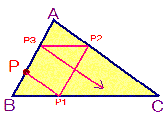 (参考)ちなみに点PがABの中点のとき,中点連結定理から,P3とPが一致し,よしお君は周の半分しか移動しない内にPに戻ることになる.Pがそれ以外のときは,たとえ端点のA,Bに一致したときでさえ,上記の通りになる