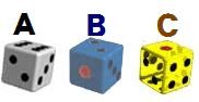 よしお君は、3つのサイコロをなげて遊んでいます。 A、B、Cの3個のさいころをなげ、Aのさいころの出た目の数を百の位の数に、Bのさいころの出た数を十の位に、Cのさいころの出た目の数を一の位として3桁の自然数を作ります。