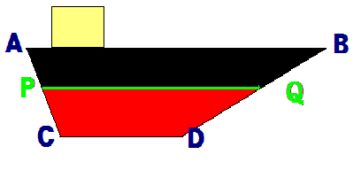 よしお君は、コンテナ船のイメージ図を書きました。 ここで問題です。赤い台形PQCDの面積と黒い台形ABPQの面積が全く同じになるとき、線分PQの長さは何cmになるでしょうか。 |