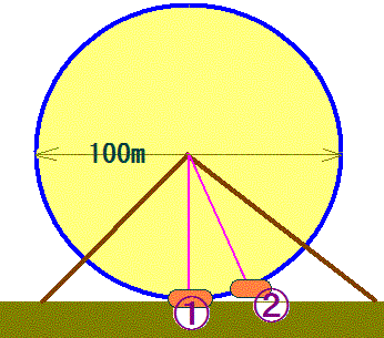 円周は314m。4台先のゴンドラ2と1とは、24度の差がある。