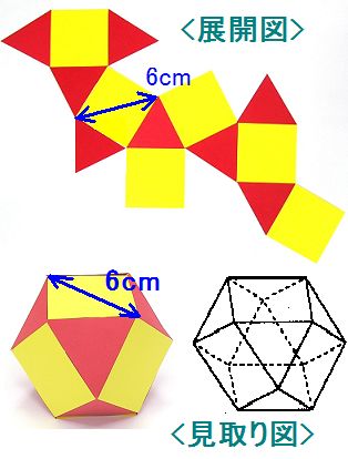 左上の写真はある立体の展開図です。また左下は、展開図を組み立てたときの立体の見取り図です。