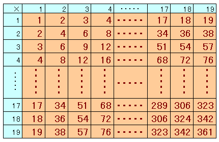 左表を見てください。これは、インドで用いられている九九表だそうです。 日本で掛け算九九といいますと、文字通り縦横1から9の組み合わせで81ですが、インドでは掛け算は1かける1から19かける19まで覚えるそうです。 ここで、問題です。 ※ 二桁の掛け算の結果を覚えていれば、答えがパットでますから、インド人は計算能力がすごいということのようです。 |