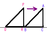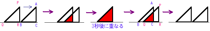 <問題>下の図のように、直角をはさむ辺が6cm、12cmと6cm、6cmの異なる直角三角形と直角二等辺三角形△ABCと△PQRがあります。 △PQRが矢印の方向に毎秒1cmの速さで動くとき、重なった面積の変化を考えなさい。 |