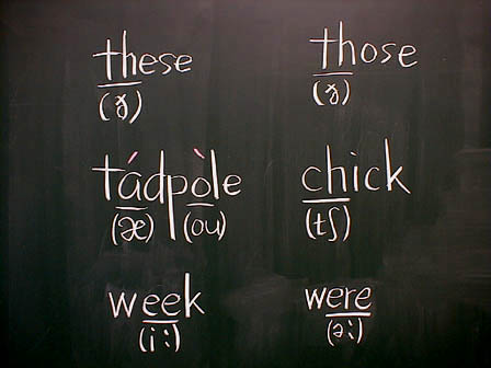 黒板に左のような板書をする。新出の記号については、発音の仕方を丁寧に指導する。その際、英和辞典などの発音の手引き等を参考にしながら、発音のコツを教え、こちらのモデル(やや大げさに行う)の後について、実際に発音させる。