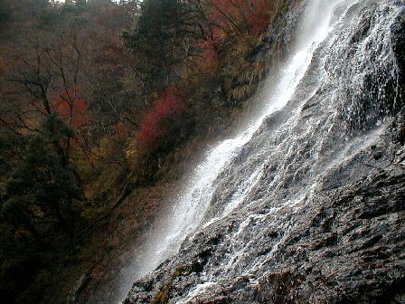 滝の真横を近距離から撮影したものです。水流の激しさが伝わってきます。また、バックの紅葉した樹木がきれいです。